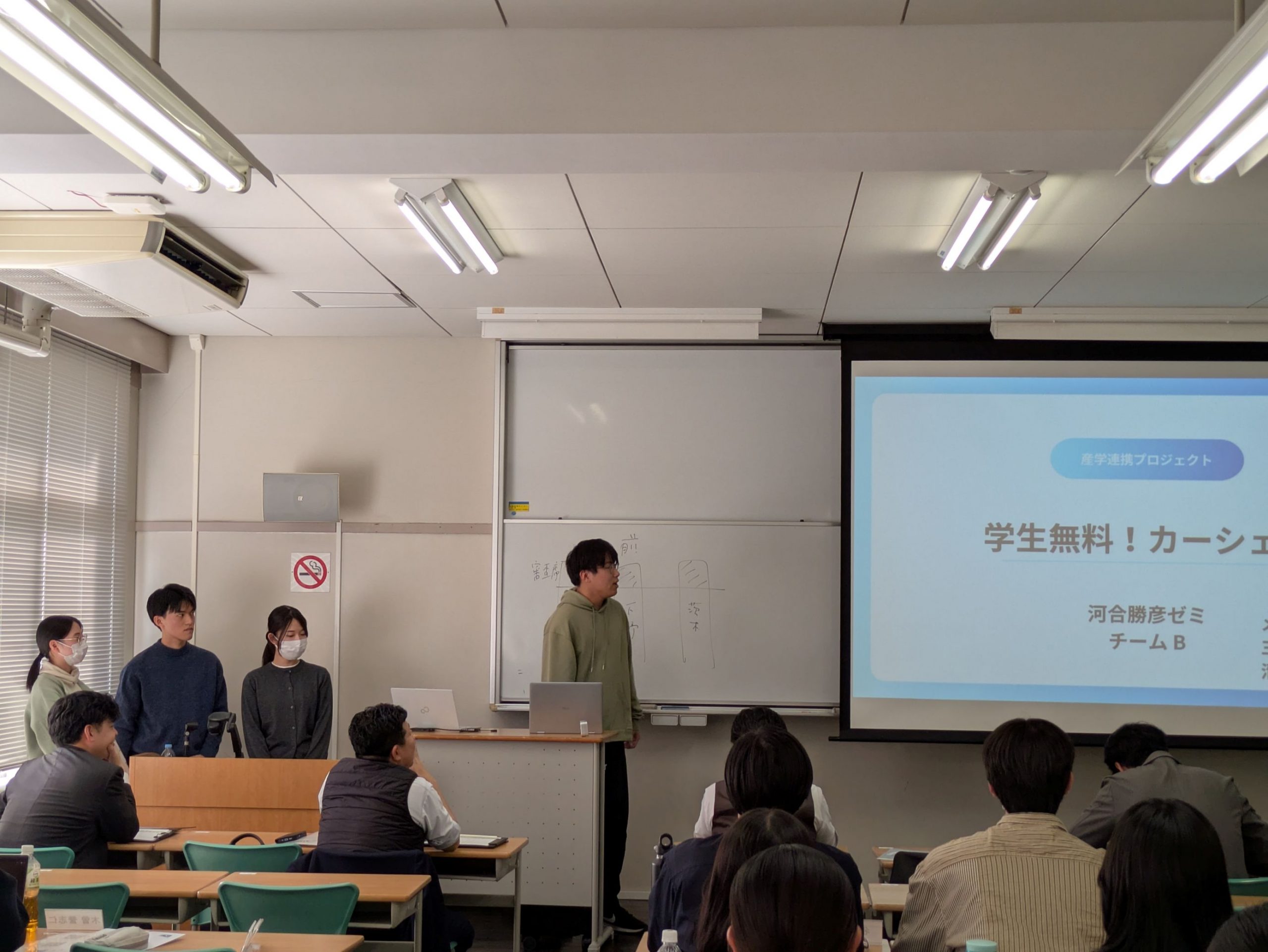 11月下旬には最終発表会が開催され、3ゼミ6チームが大学生向けの新たなカーリースのアイデアを提案しました。審査の結果、「学生無料!カーシェア」というアイデアを提案した河合勝彦ゼミチームBが最優秀賞を受賞しました。以下は河合勝彦ゼミチームBの喜びの声です。